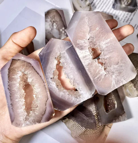 Agate is known for its grounding and stabilizing properties, promoting balance, inner peace, and emotional healing. The geode’s natural cavity, filled with sparkling crystalline formations, enhances the stone’s ability to amplify and focus energy, creating a powerful focal point for any space.