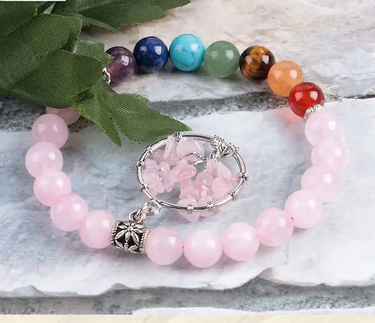 Rose Quartz Chakra Bracelet with Tree of Life Charm